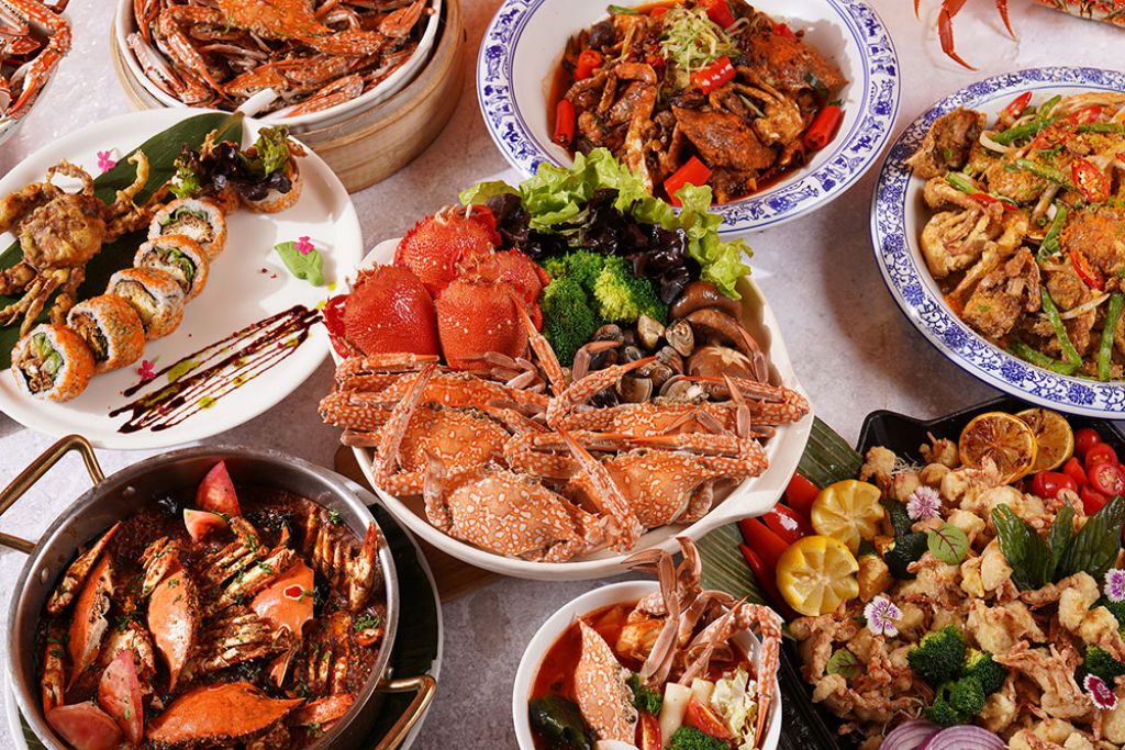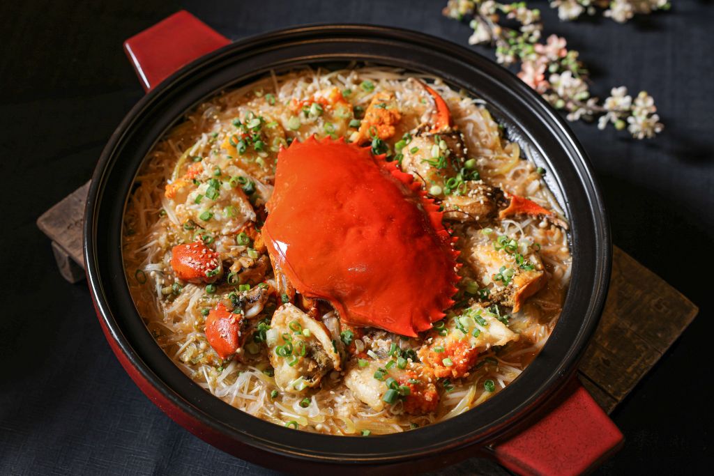 鄔海明主廚規劃一系列蟹宴,酸菜粉絲燒膏蟹、砂鍋薑蔥松葉蟹、黑椒牛油炒蟹與雞油花雕蒸膏蟹等色香味美新品,歷年熱銷的生拆膏蟹燴麻婆豆腐、老香港咖哩蟹、外婆飄香蟹、花雕凍毛蟹及蟹粉小籠包等經典蟹餚限時回歸,多達十數種蟹料理任君選擇。還有品蟹後適合暖胃的燕窩薑茶湯圓與薑汁燉奶等甜品。