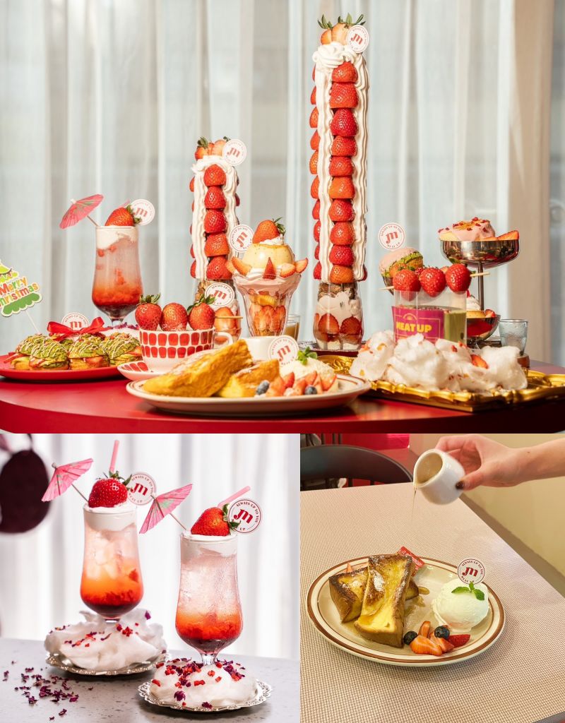 101草莓塔(普通/豪華草莓塔)以台北101為靈感,豪華版高達30公分,滿足視覺與味蕾雙重享受。莓你的份(草莓烤布蕾慕斯)是款浮誇仿東北火鍋,充滿水果香氣甜而不膩。加入乾冰營造迷人煙霧效果。