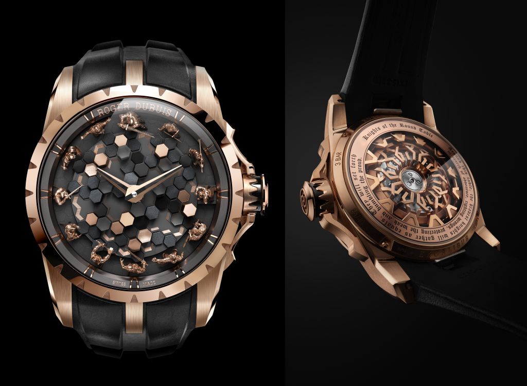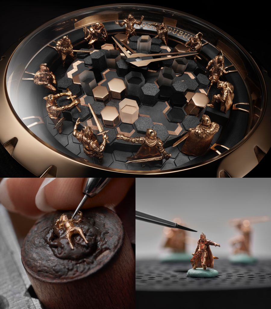 45毫米玫瑰金錶殼上錶冠護罩設計造型有如劍柄護手,象徵著梅林的魔法故事——當時梅林幫助亞瑟王從石中拔出傳奇之劍,宣告命運授任他成為真正國王。12位騎士各自擁有獨特時標,彰顯無可比擬的姿態,動感、張力與力量交織。工匠為騎士們添加一層黑色銅綠柔化亮度,突顯騎士浮雕中褶皺、對比與最細微細節。
