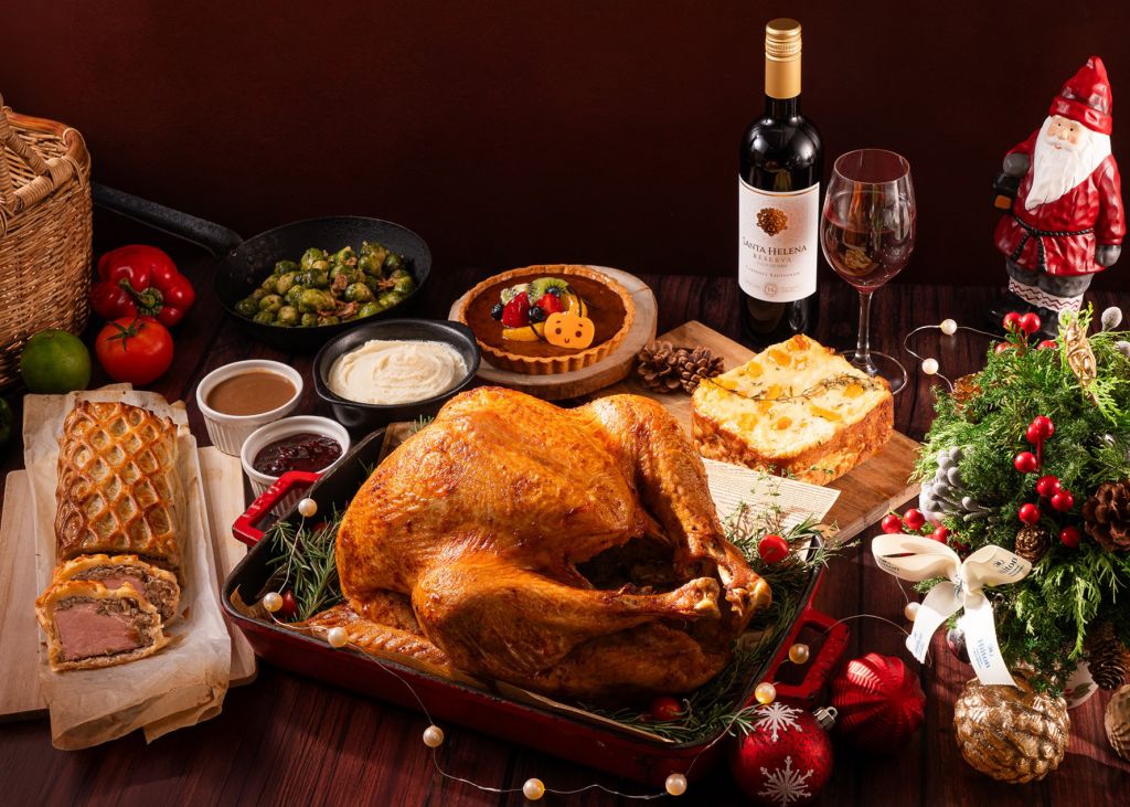 2樓悅市集自助餐廳推出”聖誕感恩節火雞禮籃”,嚴選重達6公斤肉質鮮美美國進口火雞,慢火炙烤搭配手工蔓越莓醬汁一同享用,清爽解膩、更添風味。還有皮酥肉嫩的爐烤火腿威靈頓及精緻豐美配菜,附贈手工南瓜派以及精選紅酒,迎接年度盛事新北歡樂耶誕城,共享溫馨美好時光。