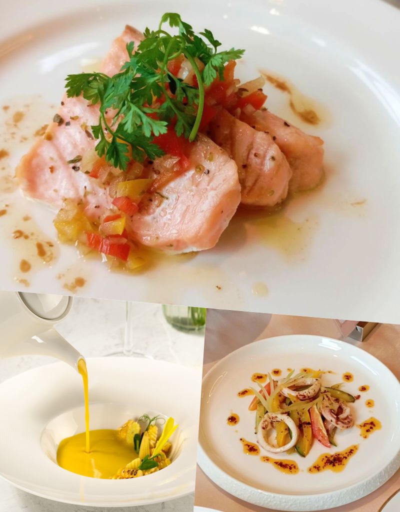 “彩椒油醋漬挪威鮭魚”鮮嫩多汁,帶油醋清爽酸香;"香麻香芹櫛瓜透抽沙拉"以椒麻香氣搭配Q彈鮮嫩透抽,增添口感層次;"東南亞香茅奶油玉米湯"獨特香茅清香,以5種不同料理方式表現黃玉米。