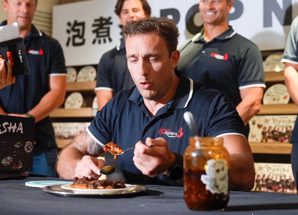 同場加映,吃牛麵加辣更有味!澳洲消防員來台展開8天公益之旅,最終章選定阿舍食品現身最新POP-UP Store挑戰阿舍新品辣椒脆油與台灣小吃,為公益之行劃下完美句點。