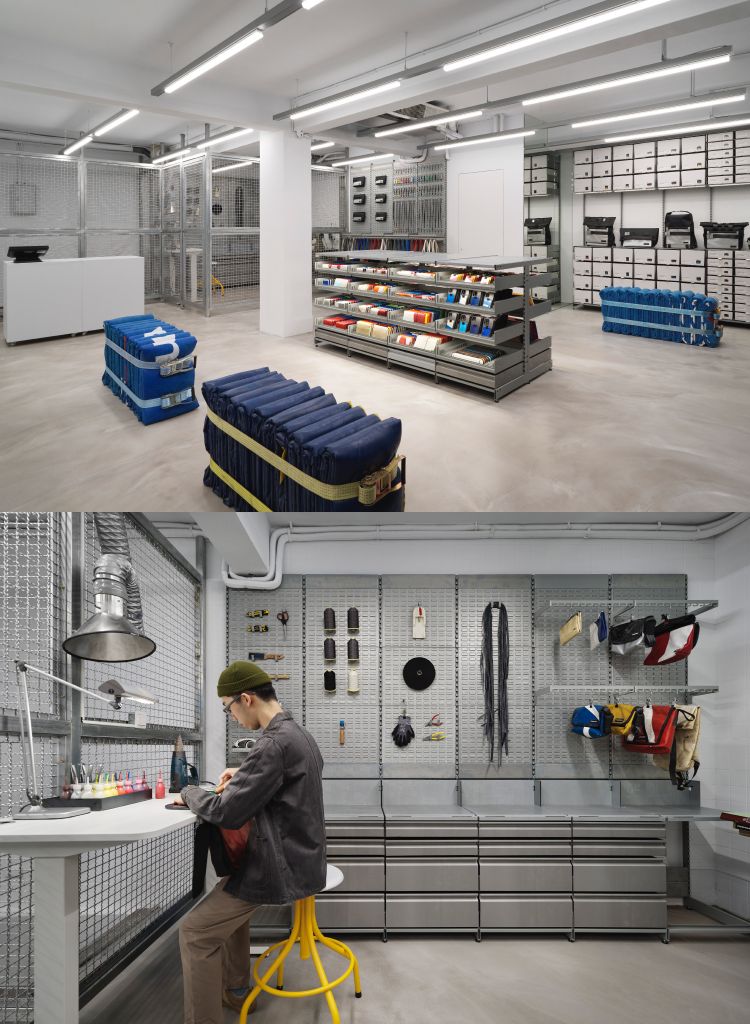 FREITAG by FUJIN TREE GROUP改裝重啟,延續FREITAG強烈工業設計風格,店面裝潢基調參考瑞士工廠氛圍,運用全球直營門市獨有鐵製櫃體V90 SYSTEM,附可調節櫃腳能應現場陳列需求更動組裝方式,營造難以忽視的存在感。提供包包醫生(BAG DOCTOR)專屬維修空間,穿透的鐵柵欄隔間設計能現場直接觀賞修復包袋過程。