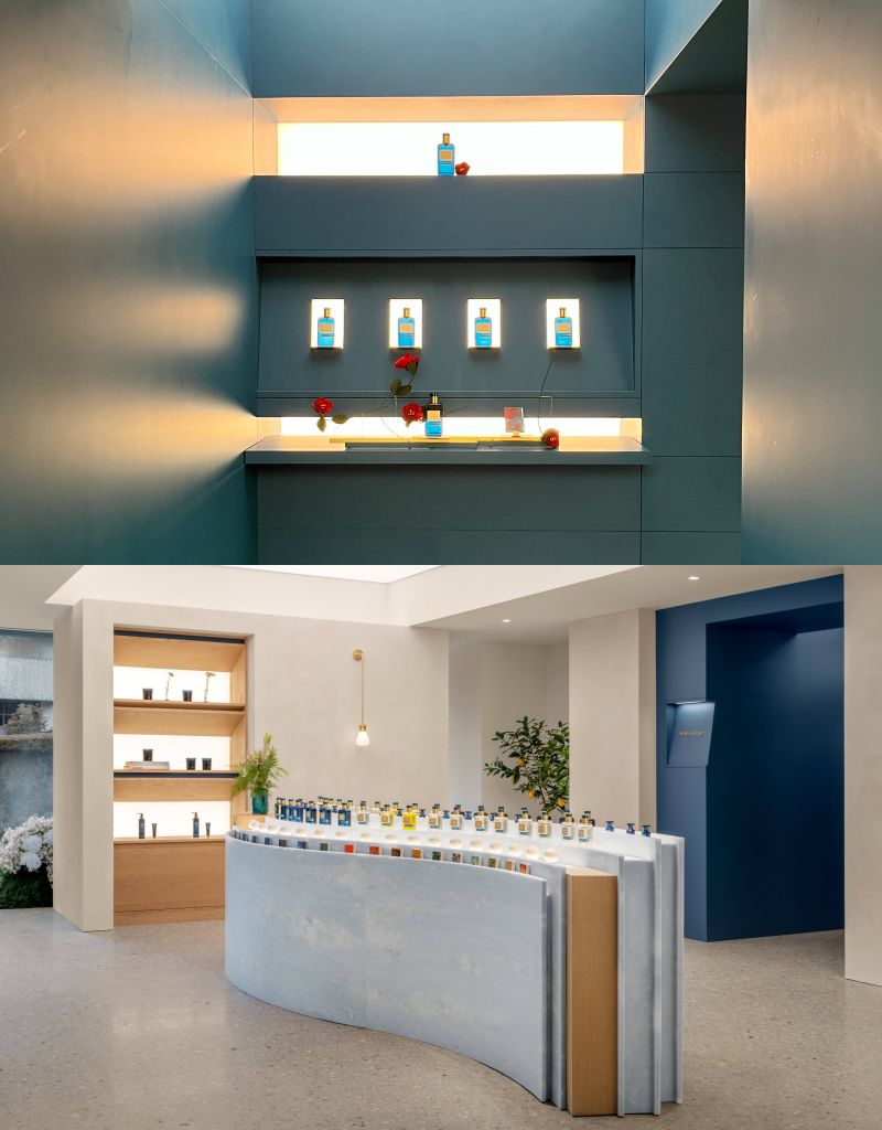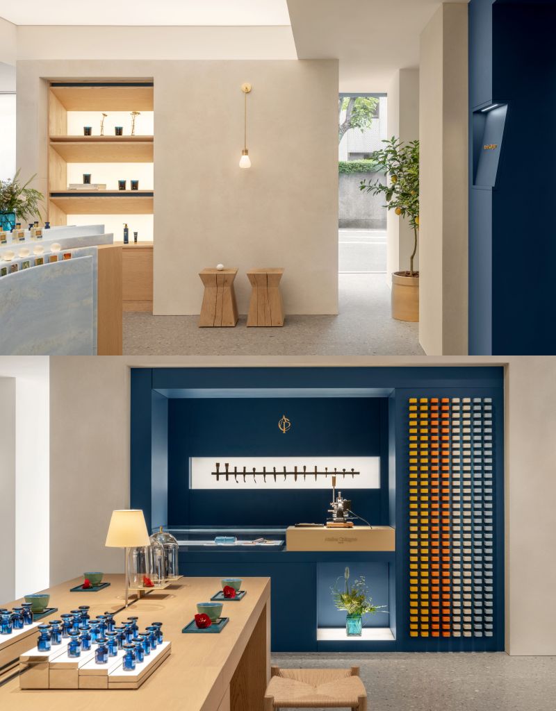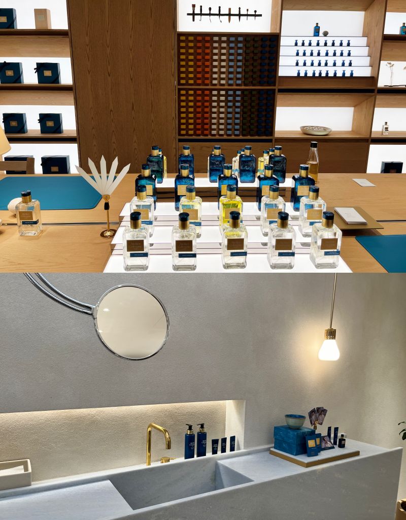 採用溫煦色調松木及天然淡藍石材打造”調香琴”曲線造型陳列桌,彷若致敬傳統調香桌,收編氣味自然溫度,再展細緻優雅姿態;最具代表色”匠藝藍”陳列櫃上,收納訂製皮革及工具,彰顯匠研服務樣貌,琳瑯滿目的訂製皮套與法式禮盒包裝,感受藝術品般禮贈。
