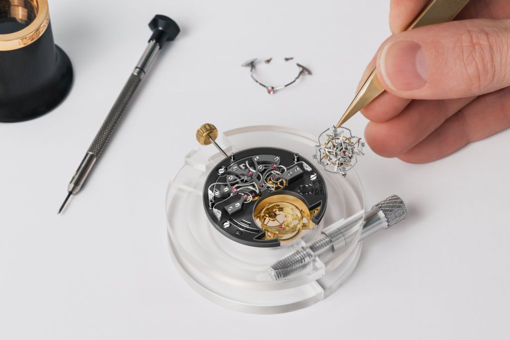 Ode to the four Guardians腕錶平均採用10~12種木材、共超過200片細木鑲片,耗時4~6週製作,用色明亮不顯突兀,符合亞洲文化內斂與節制。選用188個零件自製組成2160超薄陀飛輪自動上鏈機械機芯,具備時間顯示、附帶小秒針功能陀飛輪、邊緣式自動盤,厚度僅5.65毫米。