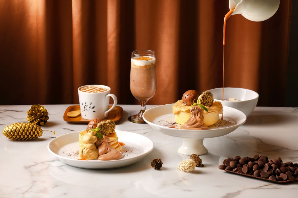 焦糖巧克力鮮奶油鬆餅系列以略帶大人苦韻以54%比利時巧克力製作,詮釋入秋後的巧克力與焦糖溫潤感,搭配義大利巧克力冰淇淋帶來些許涼爽風格,平衡整體風味。精選雲林斗南越光米製成圓形小巧芝麻花生米菓妝點可愛氛圍與鹹甜酥脆口感。