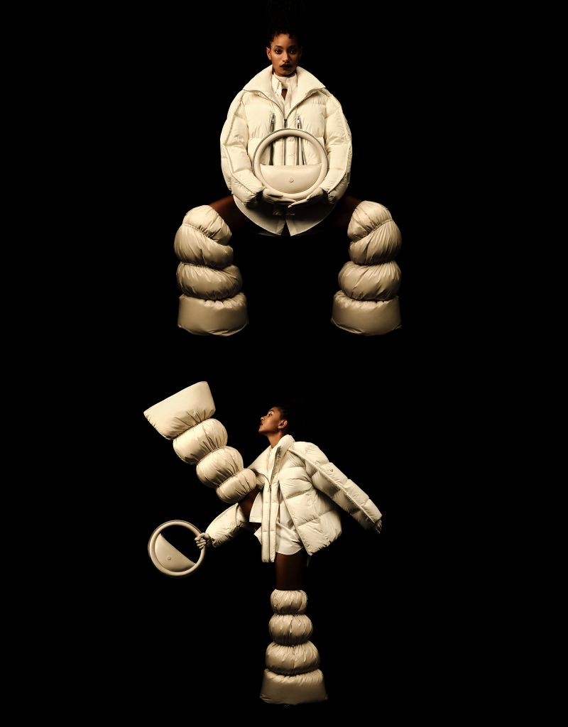 羽絨連衣裙形似睡袋,致敬盟可睞MONCLER經典羽絨服,搭配可拆卸下擺及超大口袋,塑造多變造型。工裝風帆布長褲可通過拉鍊轉換為短款廓形。黑色與月塵白色調構成鮮明對比,增強二元對立,凸顯WILLOW作品極簡美學與百變魅力。