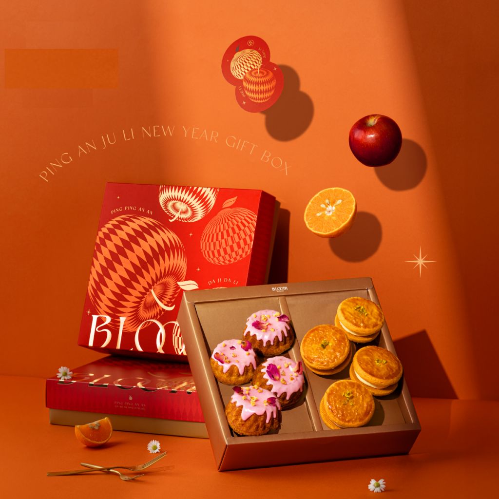 花園蘋果蛋糕與橘子布列夾心2款全新口味甜點能品嘗到花神BLOOM WEDDIℕG法式手工甜點的講究與高水準。禮盒結合幾何圖案與燙金設計,展現蘋果與橘的圖形,讓過年必備紅色禮盒更華麗耀眼。禮盒巧妙印刷著"平平安安"與"大吉大利"拼音文字,增添了趣味性,也充滿濃厚新年氛圍。