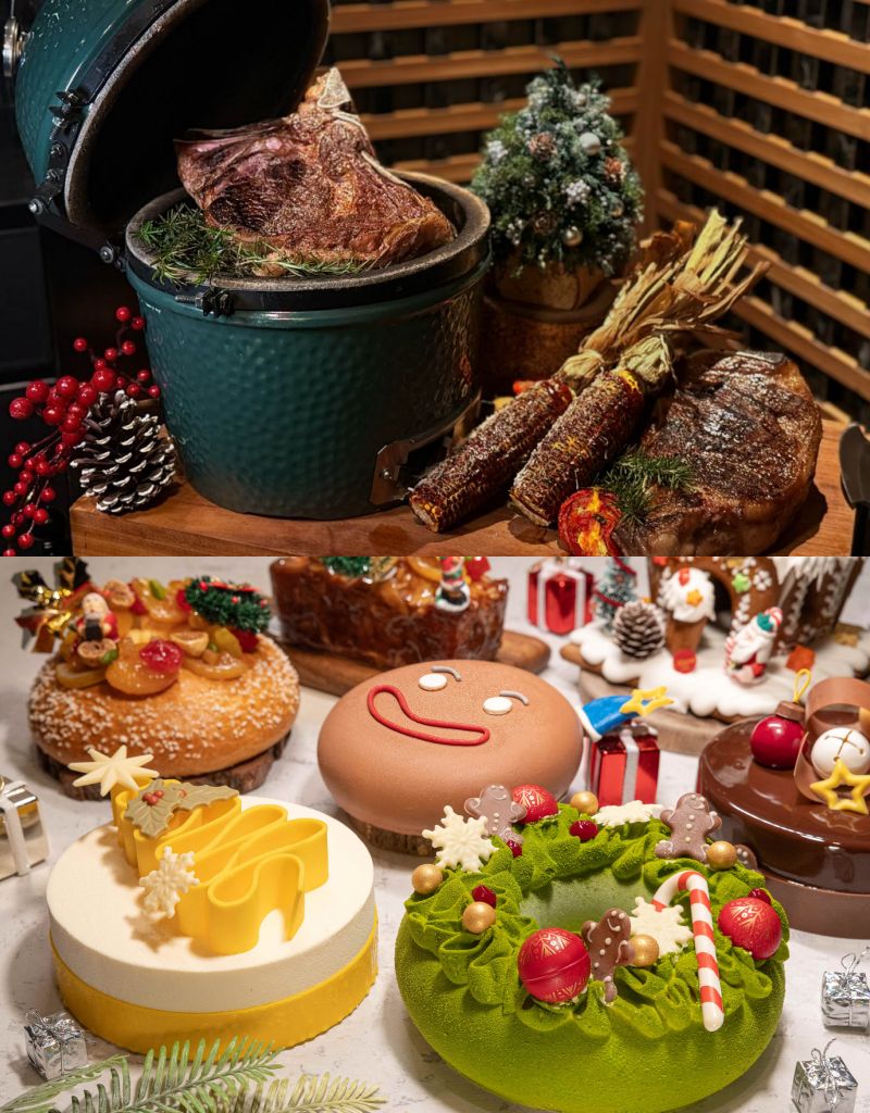2樓ROBIN’S牛排屋主廚團隊獨家引進日本F1帶骨牛排,以豪邁直火炭烤帶出特有油脂香氣,出菜前使用特殊爐具進行煙燻,展現爆發的香氣與視覺效果。菜單有日本F1帶骨肋眼、丁骨及紅屋3種部位選項,包含雙人湯品、豐美耶誕沙拉吧及特製耶誕甜點。