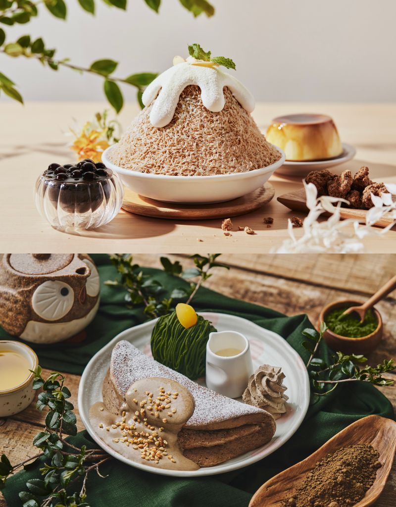 焙茗抹茶蒙布朗鬆餅首度將日本靜岡焙茶製成雲朵般柔軟鬆餅,醇濃迷人焙茶香氣與甘甜溫潤回甘口感,略帶焦糖色外觀及特有清新茶味,口感層次分明。搭配蕎麥香氣襯托高雅茶香餘韻,點綴日式抹茶蒙布朗與香草冰淇淋,一次享受雙重經典茶滋味,獨具特色濃郁回甘滋味,是專屬大人味日式甜點。