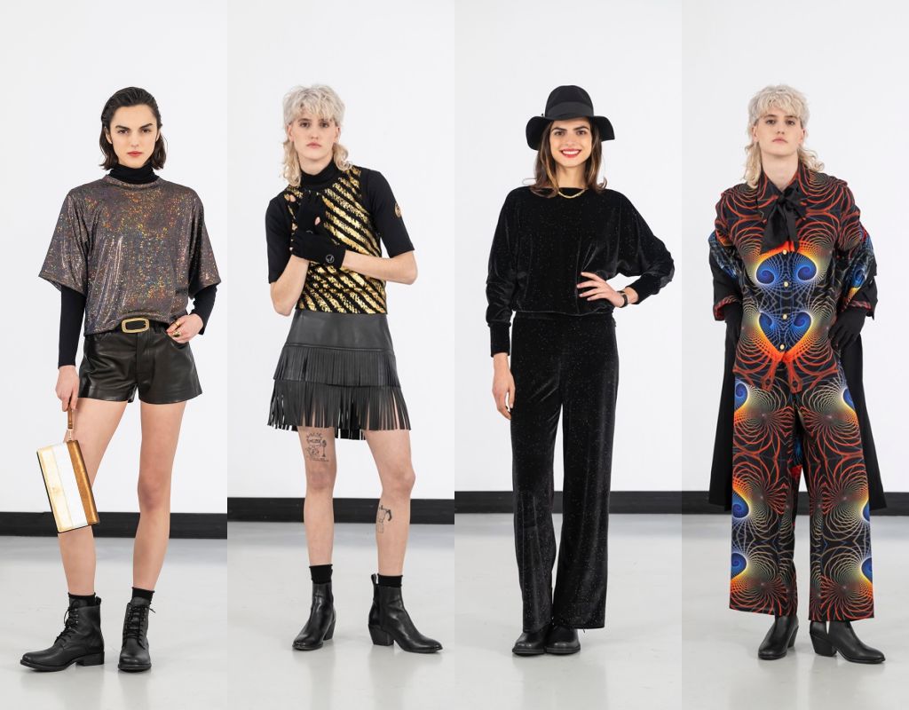 羊駝毛針織背心毛衣飾以金葉印花,搭襯流蘇皮革短裙,呈現帶動感層次修身輪廓,為造型注入前衛搖滾風格。絲質襯衫與寬褲呈現迷幻氛圍,圖案來自藝術家Ikon設計,質地柔軟輕盈,可輕易配搭其他單品詮釋個人特色。