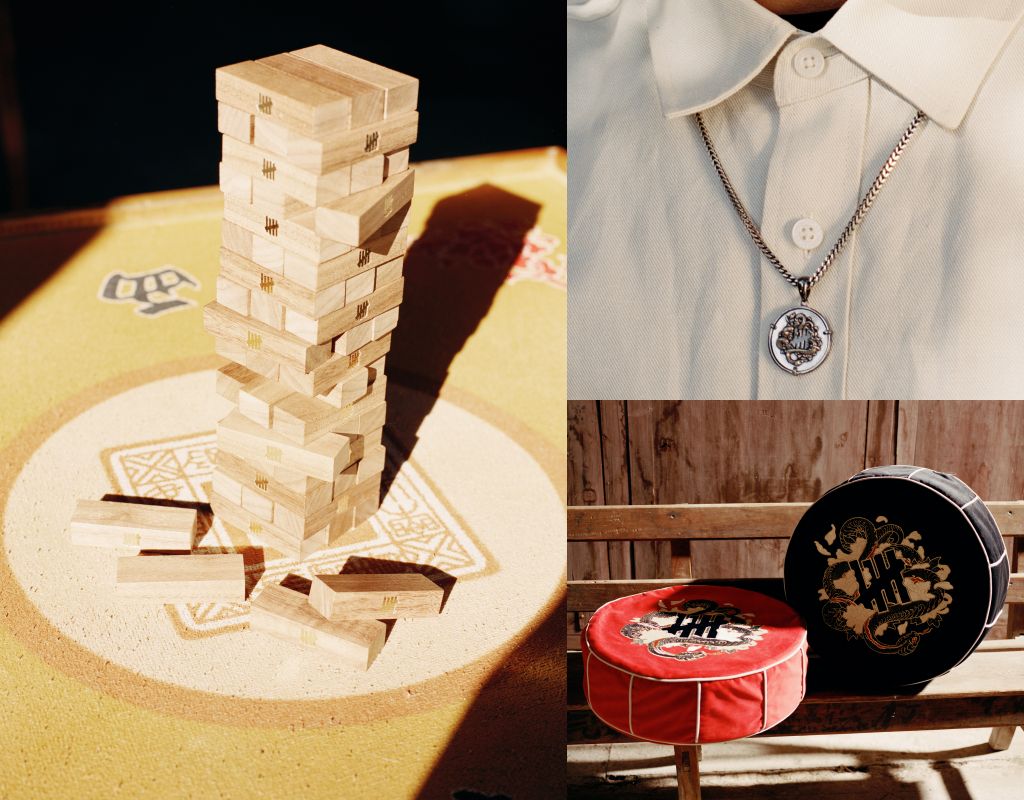 925銀材質火漆印章戒指與銀幣項鍊分別用鐳射工藝及浮雕工藝呈現金蛇與牡丹設計,凸顯暗藏Five Strike的LOGO做舊質感。絨面刺繡蒲團坐墊與抱枕營造新年團圓氣氛。