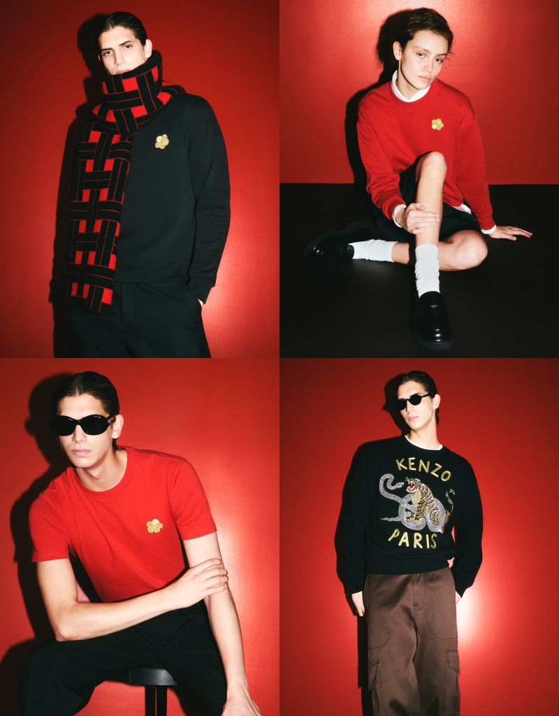 KENZO藝術總監NIGO以農曆新年視角重新詮釋牌經典標誌。將經典海棠花(Boke Flower)化為金蛇圖案,展現傳統與創意完美交融。金色與紅色象徵吉祥與富裕,貫穿整個系列,營造活力四射又不失精緻色調,服裝上珠飾與刺繡徽章等細節裝飾,增添濃厚節日氛圍。