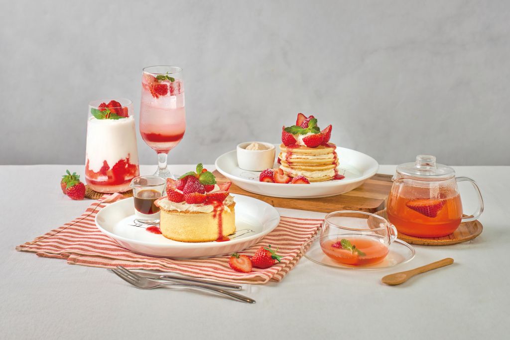 草莓提拉米蘇薄鬆餅特別層疊夾入香草卡士達鮮奶油讓口感更滑順,上方加以馬斯卡朋鮮奶油凸顯新鮮草莓片、草莓醬香甜。另附上咖啡鮮奶油自由搭配濃郁咖啡香溫暖氣息。還有冰飲草莓歐蕾、草莓氣泡飲,及草莓香檸茶熱飲可選。