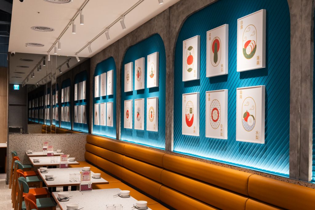 真珠首次插旗台北信義區,共61坪、102位座席及2間圓桌大包廂,室裝運用藍、橘大膽撞色,結合真珠圖騰壁畫與霓虹燈意象,展現新潮復古氛圍,菜色運用煎、煮、炒、炸等料理手法,獻上台灣人專屬的美食地圖,堆疊出新穎台菜高度。