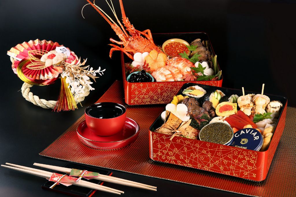 KOUMA豪年御盒延續御節料理傳統,採二層重箱設計,由主廚團隊手工製作,因工序繁瑣且費時採極限量販售,將富含各式吉祥寓意菜餚層層盛裝在精緻方型漆器”重箱"中,以招新年吉利。日式雙層漆木盒中掀開第一重,為龍蝦、鱈場蟹、南非活鮑魚等奢華菜色,風味絕佳。