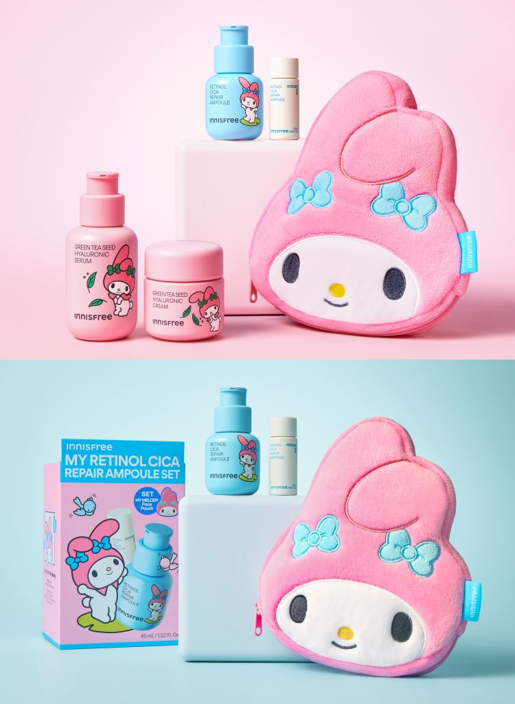 INNISFREE特別結合美樂蒂的可愛魅力,將明星商品"綠茶籽玻尿酸保濕精華"、"綠茶籽玻尿酸保濕霜"及"A醇淨膚超修護安瓶"通通換上無法抵擋的美樂蒂限量版聯名包裝,還有令人怦然心動的"MY MELODY美樂蒂收納包”等著粉絲一起收藏!