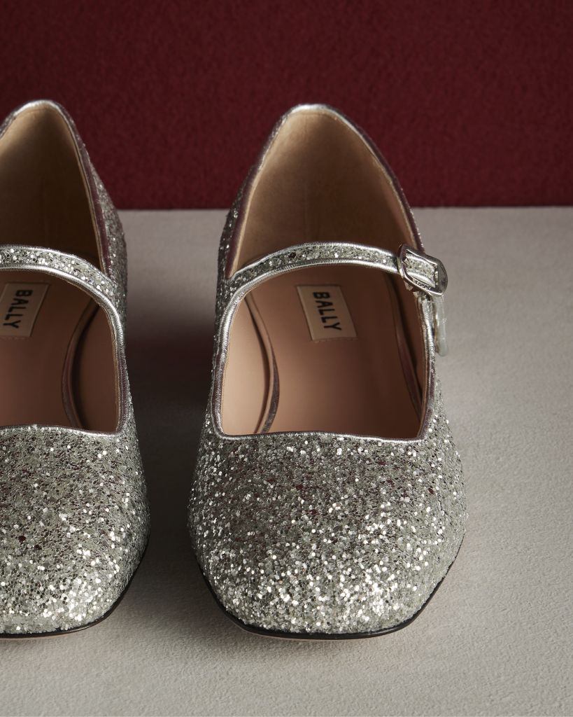 這些BALLYRINA用緞帶與加固的鞋頭製作,並在每雙鞋底特別創作BALLY獨有芭蕾舞者標誌。2025早春新款式選用不同大小亮片,層層疊加鞋面,創造閃亮耀眼視覺效果,銀色拼白色飾帶更加乘BALLYRINA重視細節的質感。