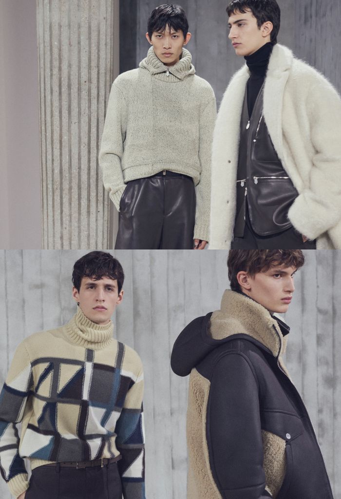 鹿皮羅紋襯衫與外套配有可拆卸羔羊毛領。羅紋外套、長款開襟衫與高領運動衫,採用羔羊毛拼接與賽馬絲綢圖案。羊絨高領或拉鍊領毛衣展現多變幾何設計。羊毛開襟衫飾絲質鑲嵌Cavalcadour素描印花。180支羊毛打造高領毛衣與開襟衫,帶有H標誌細節。羊絨與絲質混紡高領毛衣飾以étrivière H馬蹬細節。