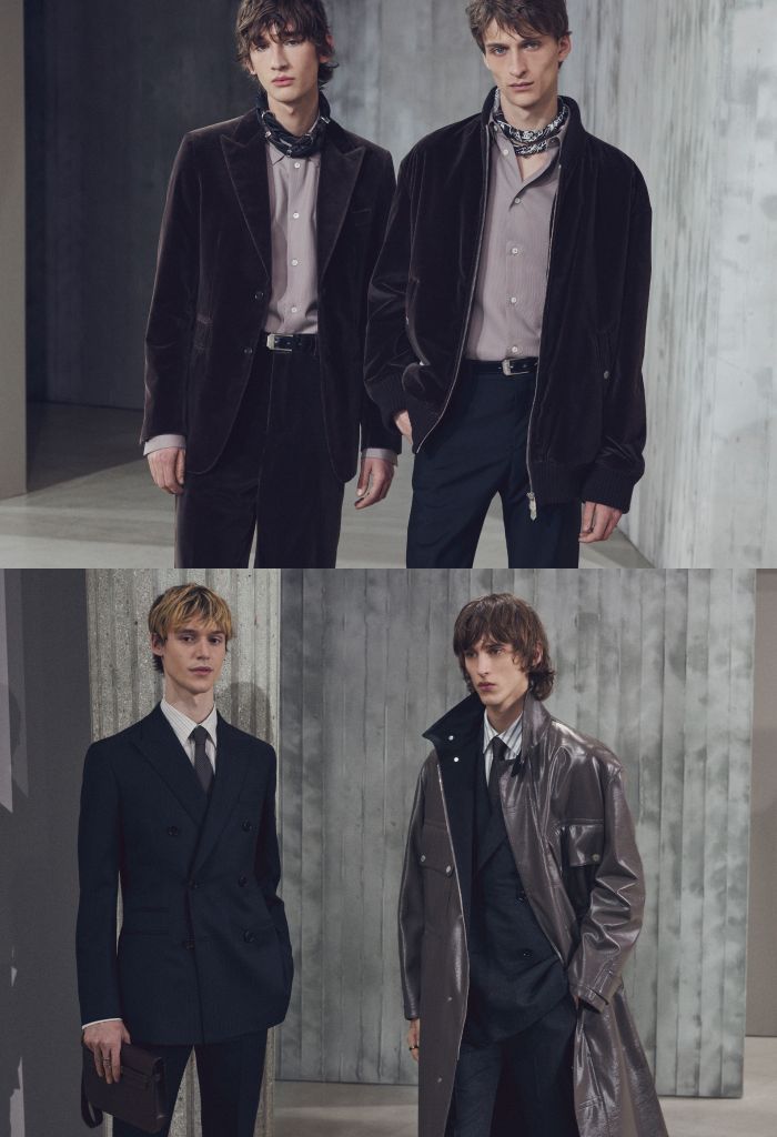 窄版長褲選用羊毛與棉質華達呢、防潑水棉斜紋布、彈性棉斜紋布等材質,融入緞面細節,塑造精準輪廓。寬版長褲搭配精緻凹褶設計,採用緊密羊毛法蘭絨、羊毛與馬海毛帆布等材質製成,及羊毛與棉質華達呢搭配皮革細節,增添搭配層次感。