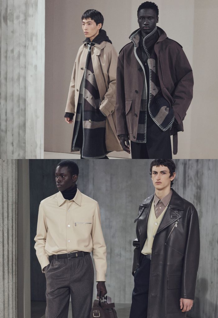在那裡披上一件寬大旅行外套,或充滿賽馬絲綢精神輕盈夾克,剪裁大方,充滿包容,勇敢迎接冬日凌冽寒意。流動之美,線條圓潤而不失力度,摩登且具圖像感,無論是短款還是長款大衣,搭配修身或寬鬆長褲。