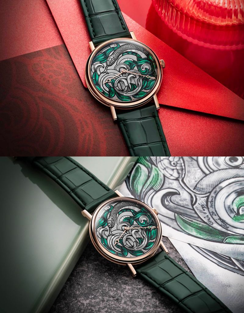 直徑40mm錶殼採18K玫瑰金打造,錶殼厚度僅6.5mm十分纖薄,外緣飾有BREGUET經典錢幣紋雕飾。錶盤裝飾結合金雕、機刻雕花與微繪工藝,銀綠雙色調搭配有機與幾何圖紋風格,將蛇的體態與蔥鬱茂葉交織成ART NOUVEAU新藝術風格般波浪線條,充滿神秘氣息又饒富生機。