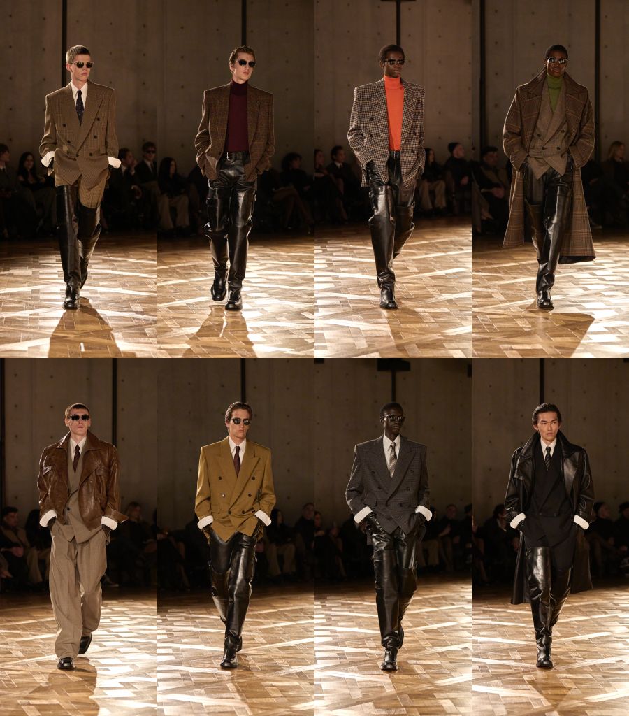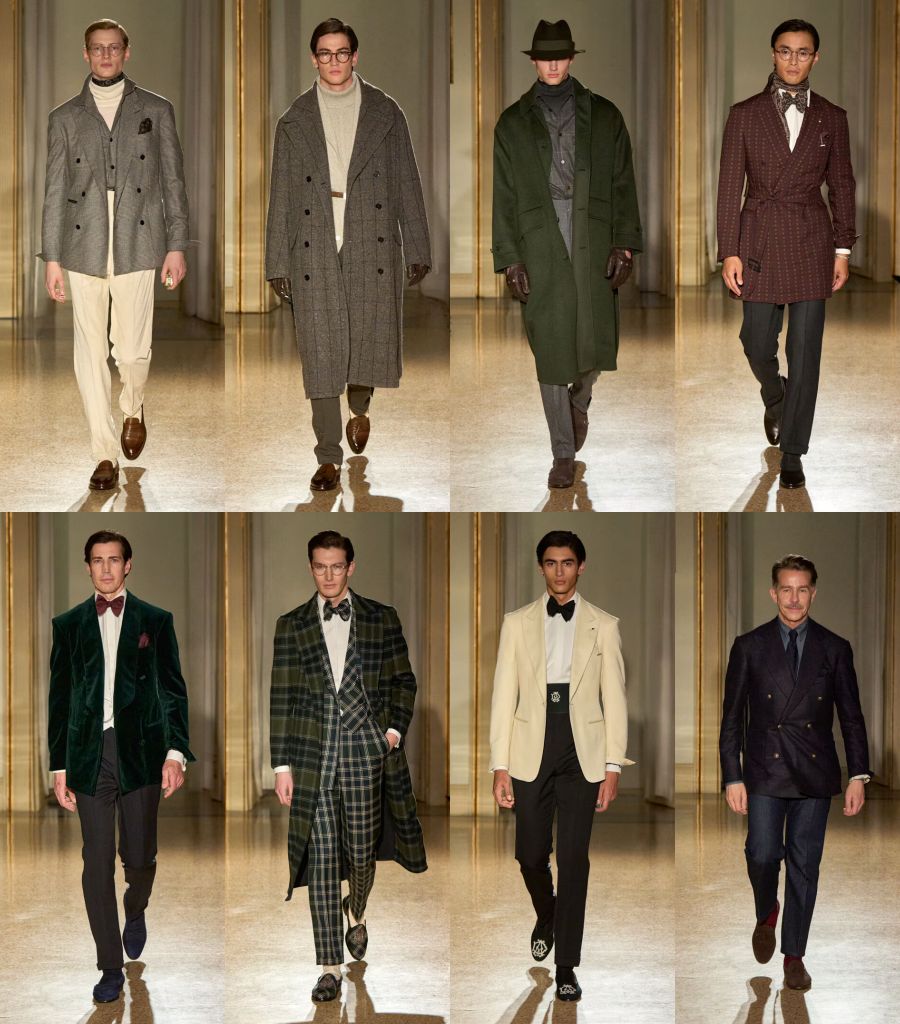 採用深淺不一高貴駝絨面料外套為開場,上衣從罕見淡金色彌漫至經典薑黃色調,單面與雙面款式均糅合Bourdon式剪裁或Balmacaans版型精緻工藝,配搭運動西服外套與寬鬆燈芯絨長褲。隨著場景轉換,設計融入彰顯軍裝氣質深海藍色Melton短外套與長大衣,點綴拋光黃銅鈕扣,展現英國紳士衣櫥瀟灑而嚴謹的兩面性,交織多元質感。