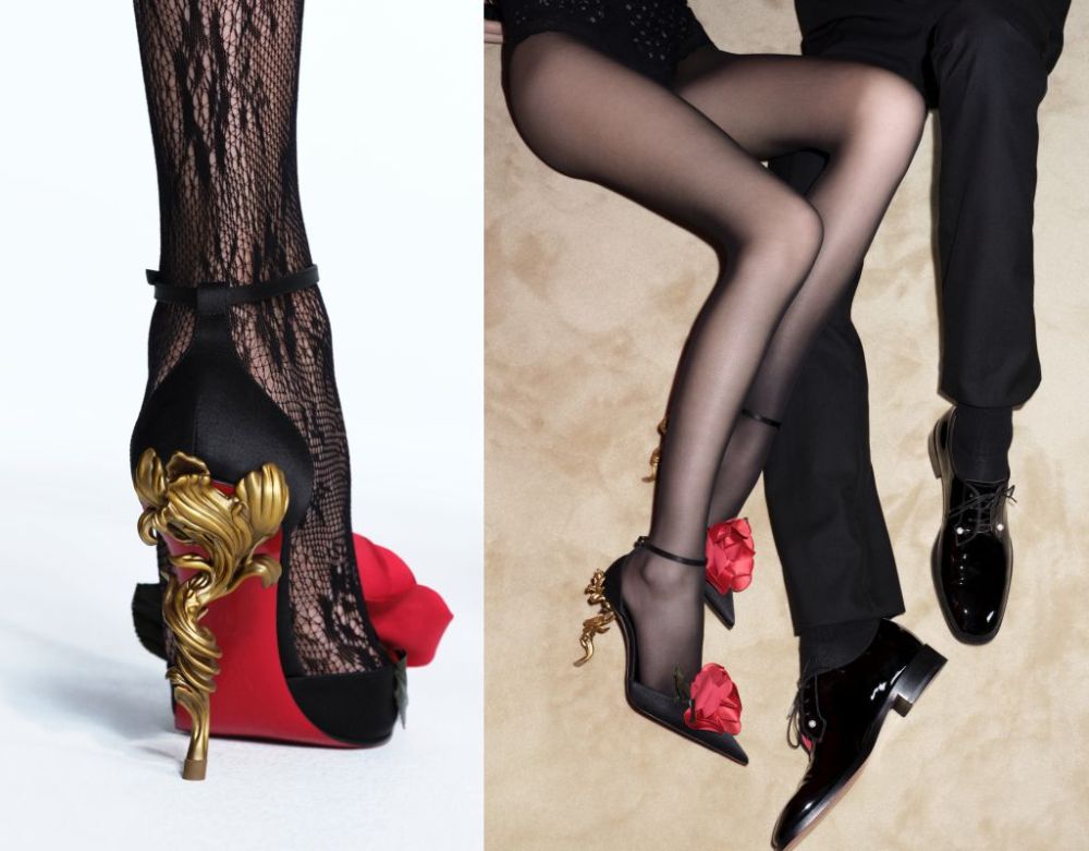 純手工製作玫瑰花,每片都由工匠手工彎曲,賦予花朵真實樣貌。鞋跟靈感源自華麗吊燈,是有史以來最具挑戰性與複雜度設計。不規則曲線雖增加穩定性難度,設計師巧妙運用精湛工藝,讓優雅與舒適完美並存。