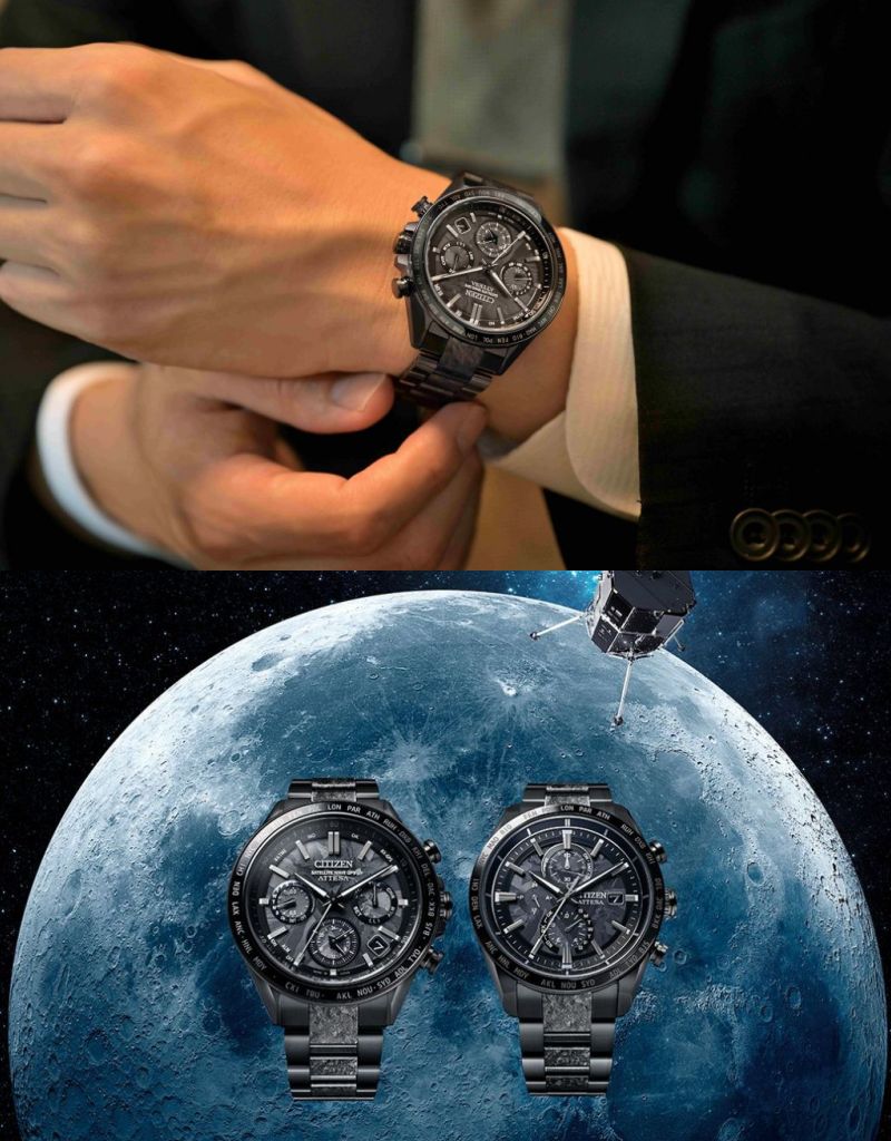 全款黑色錶殼錶代表宇宙,遠處光芒便利用特殊鍍膜技術藍寶石錶圈表現,加上銀色時標及三針,讓錶款黑中帶有光亮也更有層次,背底蓋大膽放上月球與HAKUTO-R lOGO,作為GPS衛星對時錶特別設計。