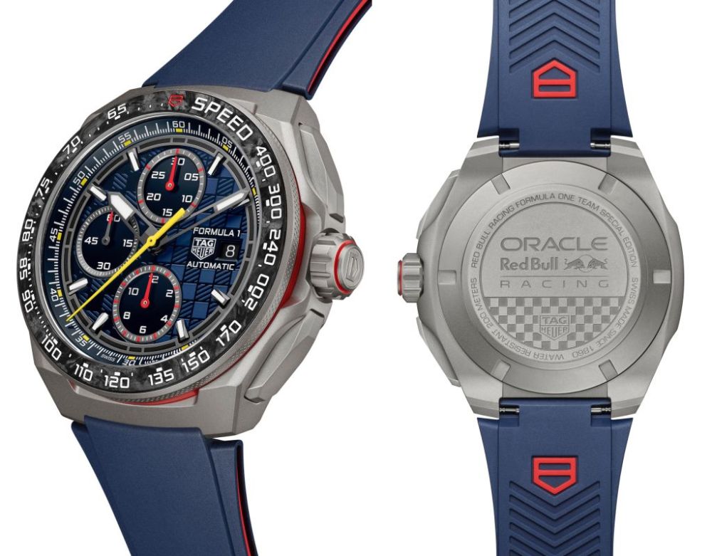 TAG HEUER FORMULA 1✕甲骨文紅牛車隊特別版計時腕錶採用2級鈦金屬錶殼,搭配嵌有鍛造碳纖維測速錶圈、雕飾賽車方格旗的藍色蛋白石錶盤,完美呼應F1賽車核心精神。腕錶每處細節都體現甲骨文紅牛車隊標誌性配色,精準運用PANTONE色調加強真實還原度。錶底鐫刻象徵F1世界方格旗,及TAG HEUER與甲骨文紅牛車隊標誌。