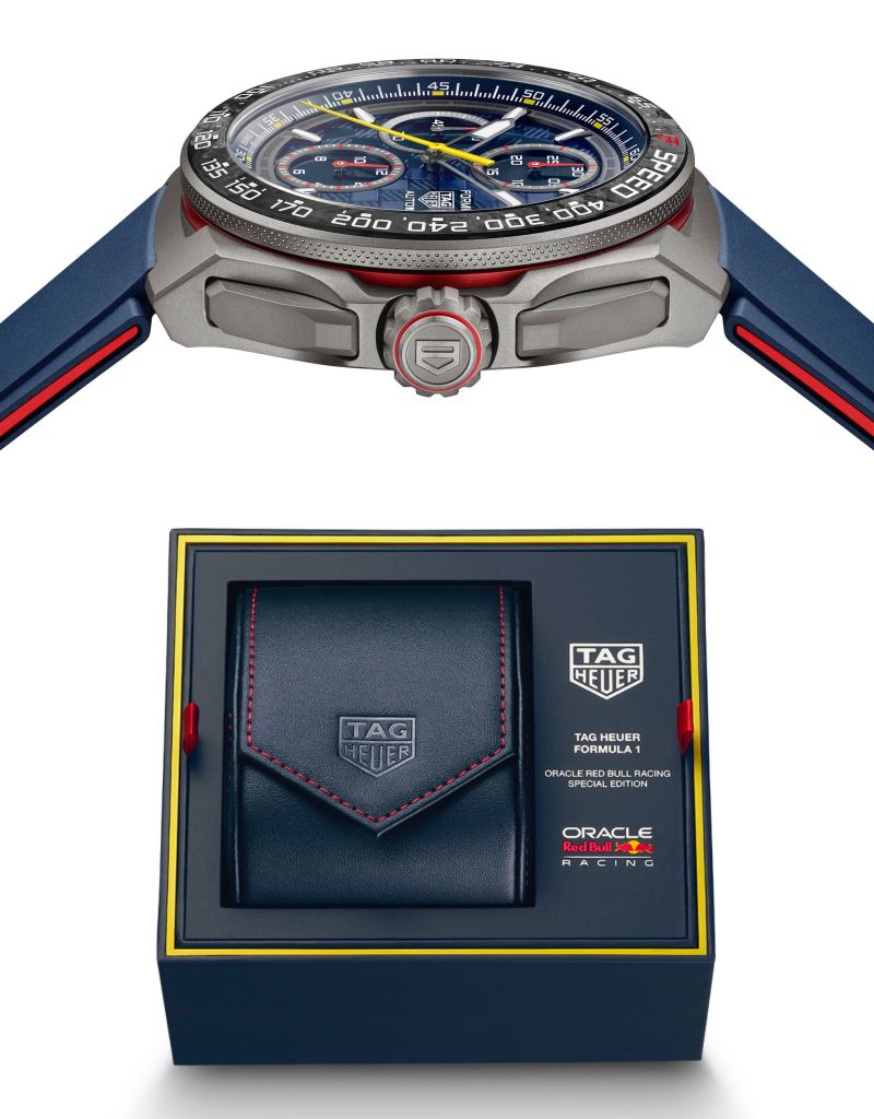 包裝設計以甲骨文紅牛車隊標誌與賽車塗裝配色為主軸,完整整體體驗並帶來獨特時計。全新特別版腕錶延續2016以來TAG HEUER與紅牛車隊最成功的合作默契,帶來更精緻聯名詮釋,將源於賽車的TAG HEUER腕錶系列提升至全新層次優雅與格調。