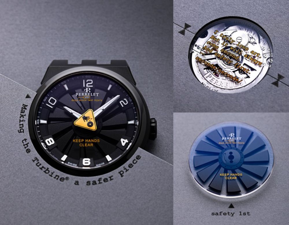 藝術家巧妙將PERRELET創立年份1777年數字轉化為”已1777天未發生任何工安事故",完全就是掛在工廠裡安全紀錄牌,幽默感滿分。錶背鐫刻著:"我真心熱愛藝術,但安全始終是第一優先考量。"(I SINCERELY LOVE ART. BUT IT WILL ALWAYS COME SECOND. SAFETY FIRST.)