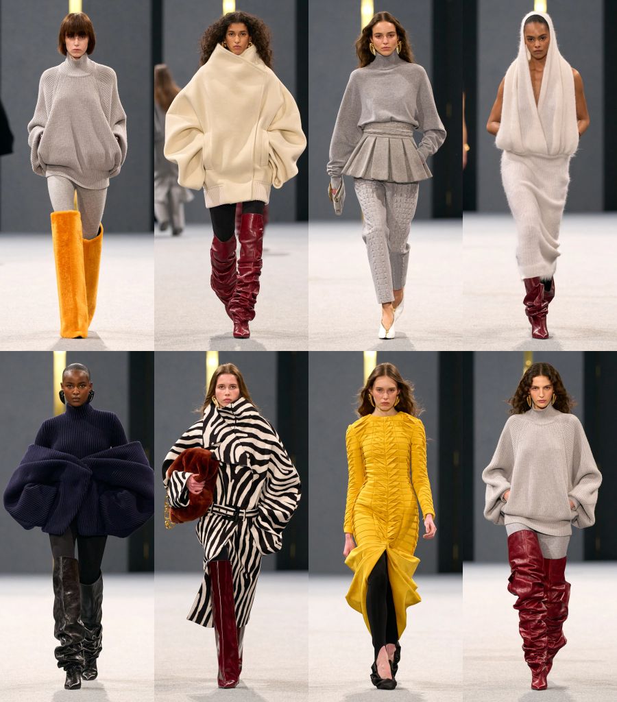 竹節與仿牛角耳環珠寶搭配犰狳外殼般樹脂手環,為造型增添獨特層次。鞋履採用全新雕塑感坡跟,隨視角變化呈現不同風貌,高跟鞋加長拉鍊設計完整包覆鞋面,靴子有硬挺或柔軟靴筒設計,可覆蓋整條腿創造獨特視覺效果。