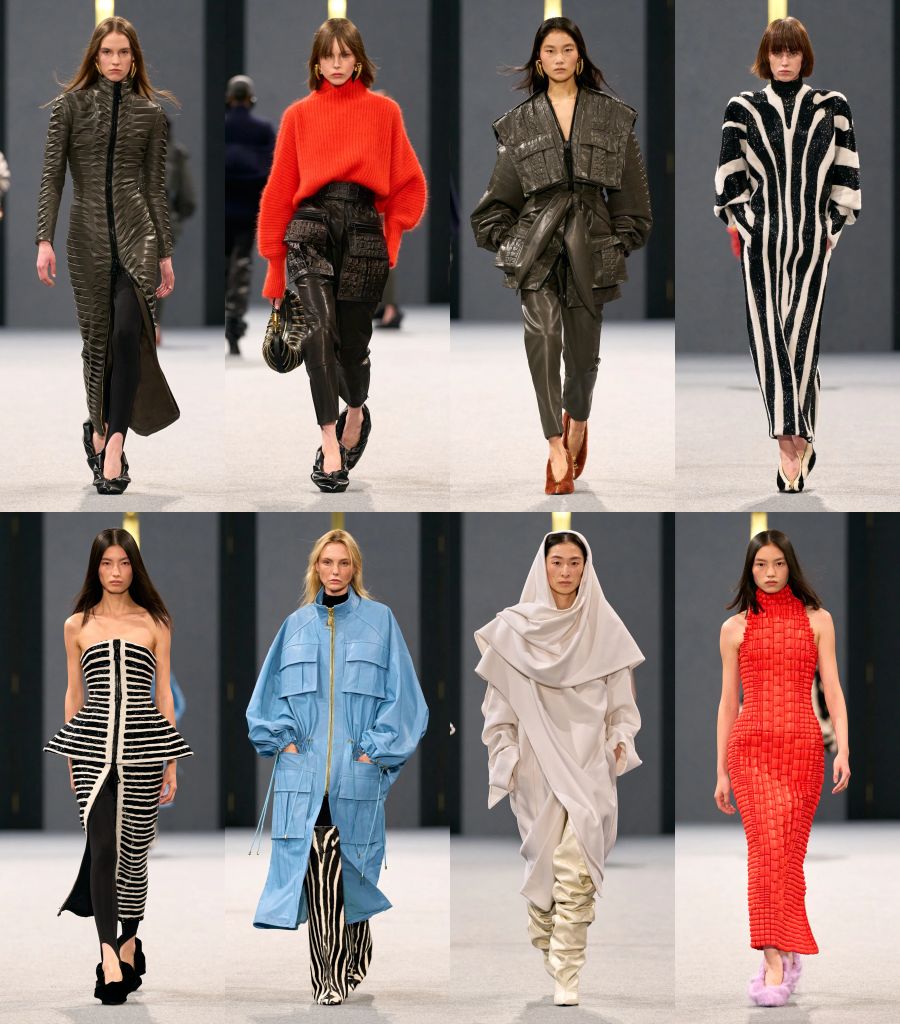 狂野動物圖騰步入城市叢林,將精湛工藝與創新技術結合:細小樹脂片組裝連接成3D鱷魚紋效果連衣裙;百褶工藝呈現鱗片流動感,以金屬拉鍊與柔美垂墜感點綴;微型串珠刺繡在輕盈面料形成視覺斑馬紋,或展現在貼合曲線連衣裙,呼應Madame Jolie輪廓;壓紋處理將鱷魚皮質感延伸至羊絨針織連身衣與緞面和服斗篷,詮釋力量與女性氣質融合。