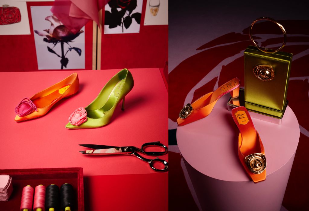 ROSE VIVIER鞋款採用緞面材質,珠寶工藝製作雕塑般金屬玫瑰,濃密的中央花蕾四周圍繞精緻螺旋花瓣。ROSE VIVIER手包款裝飾金屬玫瑰展現幾何優雅藝術,結構矩形主體與圓形帶刺裝飾手柄形成對比,手柄可以完全收起變成簡約緞面包覆盒,提供鮮豔的粉色、綠色、橙色與紫色等多種色調。