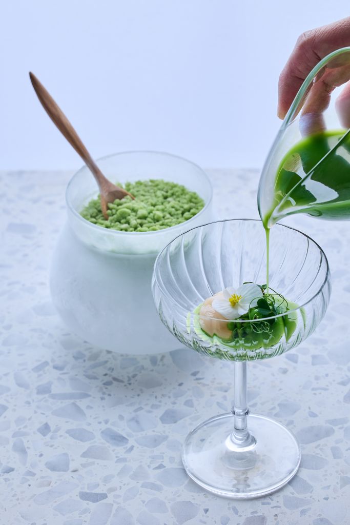 冷前菜"干貝奶酪蜜糖豆"以豆莢作為醬汁,白沙拉搭配茴香高湯,鮭魚料理運用了紅蘿蔔醬汁,展現各種蔬菜食材的原始風味與鮮美,這場春季餐飲饗宴,讓賓客們在品味料理時,感受到植物界的無限可能。