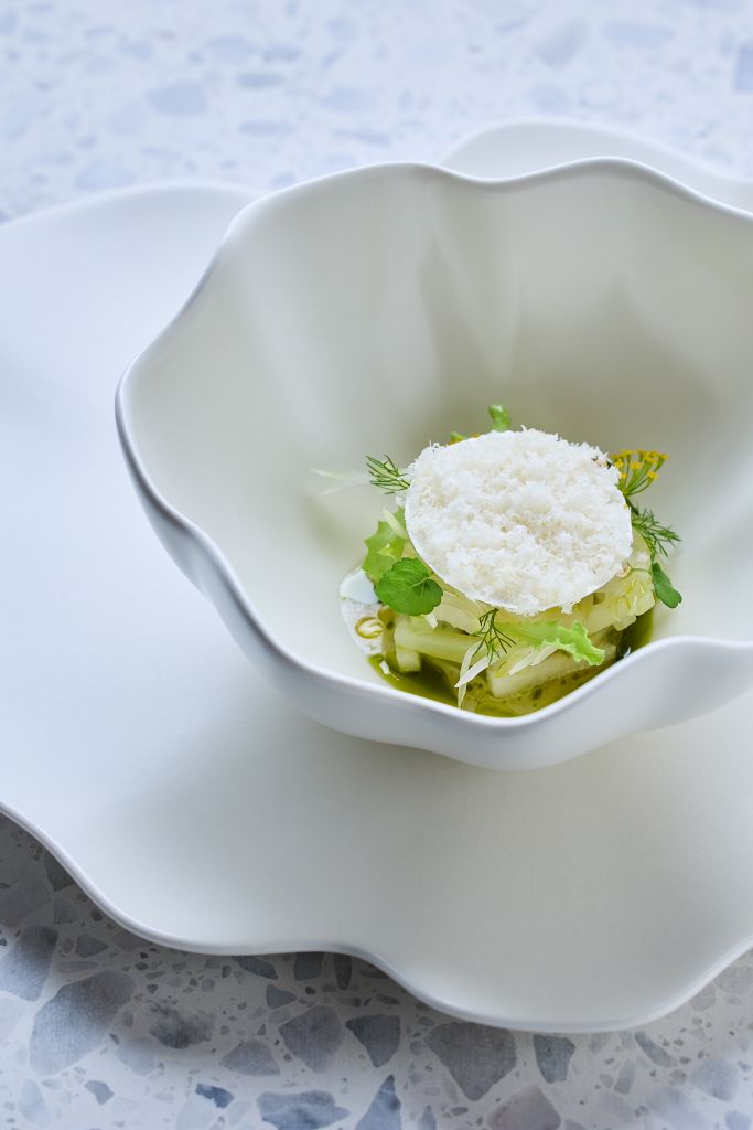 全新一季菜單從”多元質地"與"多重又感"兩大途徑探索植物食材的風味之美。Chef Alain使用甜茴香、甘藍菜、彩色蘿蔔、櫛瓜及薑等蔬菜,以不同表現手法呈現同一種蔬菜不同部位的風味。
