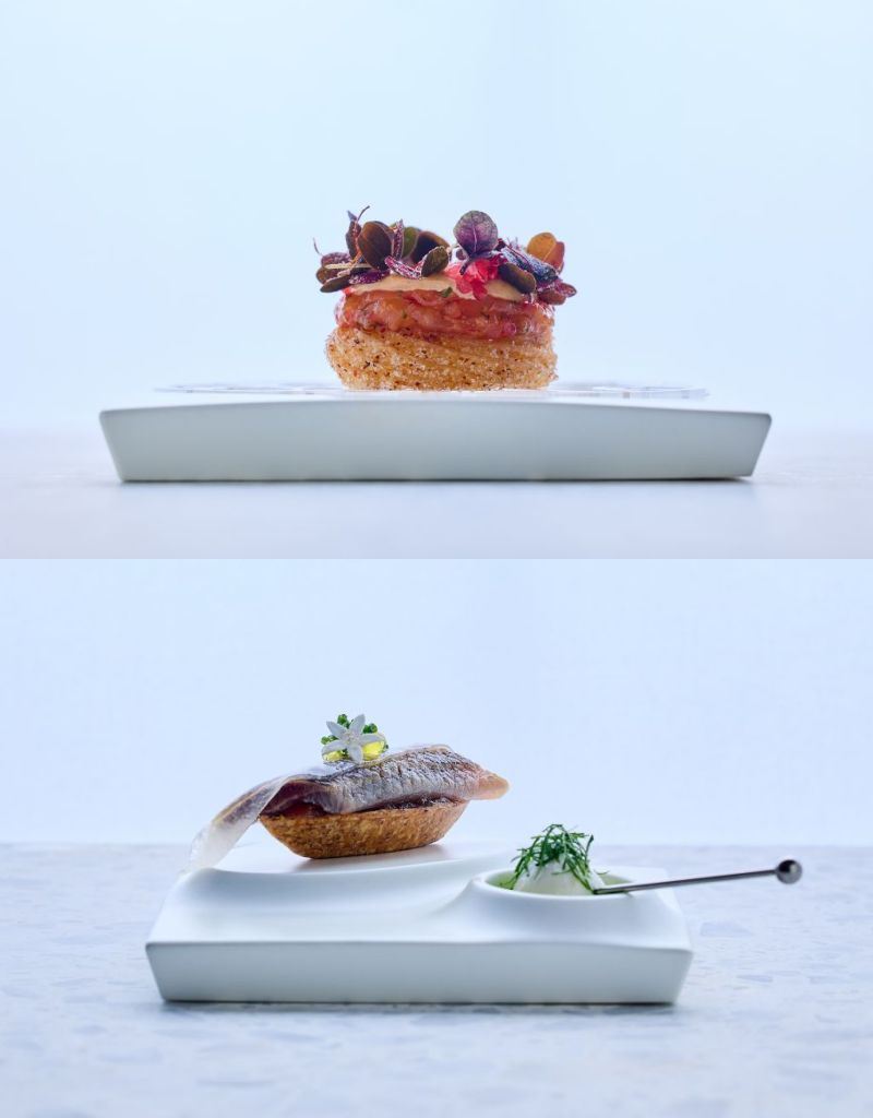 Restaurant A整體設計以白色為基礎,灰色點綴場景,以深淺不同的白色區分空間。木色家具代表亞洲與台灣,藍色抱枕象徵北歐。Chef Alain以永續思維詮釋創作菜色,致力減少食物浪費,餐具設計使用回收材料製作。