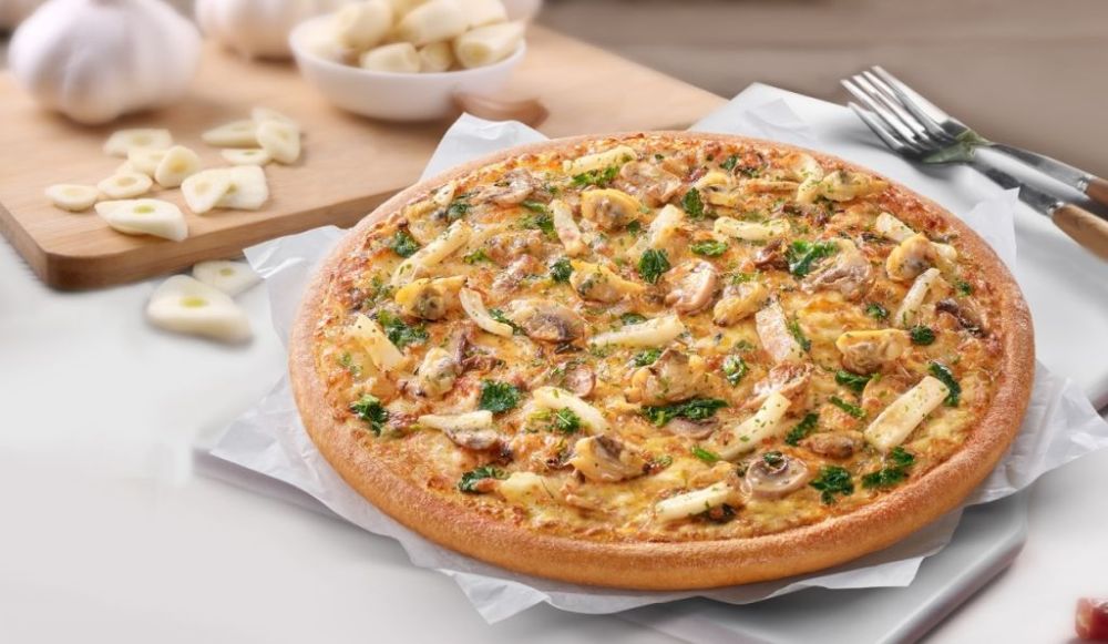 香濃蒜香海鮮比薩超台蒜香與海鮮黃金組合,嚴選粒粒飽滿鮮甜多汁蛤蜊,搭配彈牙有勁魷魚條,帶來豐富海鮮風味。獨門蒜香清炒醬融合金黃蒜末、香甜洋蔥末、辣椒與香草葉,濃郁蒜香與微辣香氣,將海鮮鮮美包裹其中,鹹香帶勁,每口都是滿滿鮮美海味與層次驚喜極致盛宴。