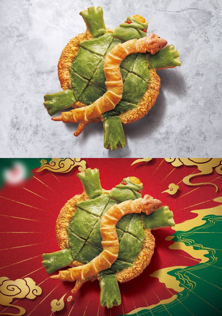 比薩上方芝心酥皮蛇結合頂級濃郁莫札瑞拉起司打造美味拉絲芝心與油亮香酥酥皮,龜殼部位能一次嘗到鹹、甜2種口味。半邊鹹香口味,大火爆香蝦米香氣搭上紮實菜脯米內餡帶出濃濃古早味;半邊甜口味嚴選屏東萬丹紅豆製成香甜不膩內餡,飽滿紅豆顆粒搭配現烤手工香Q艾草粿皮與頭、尾、手腳香濃芝心餅皮,蘊含靈獸玄武保佑與祝福。