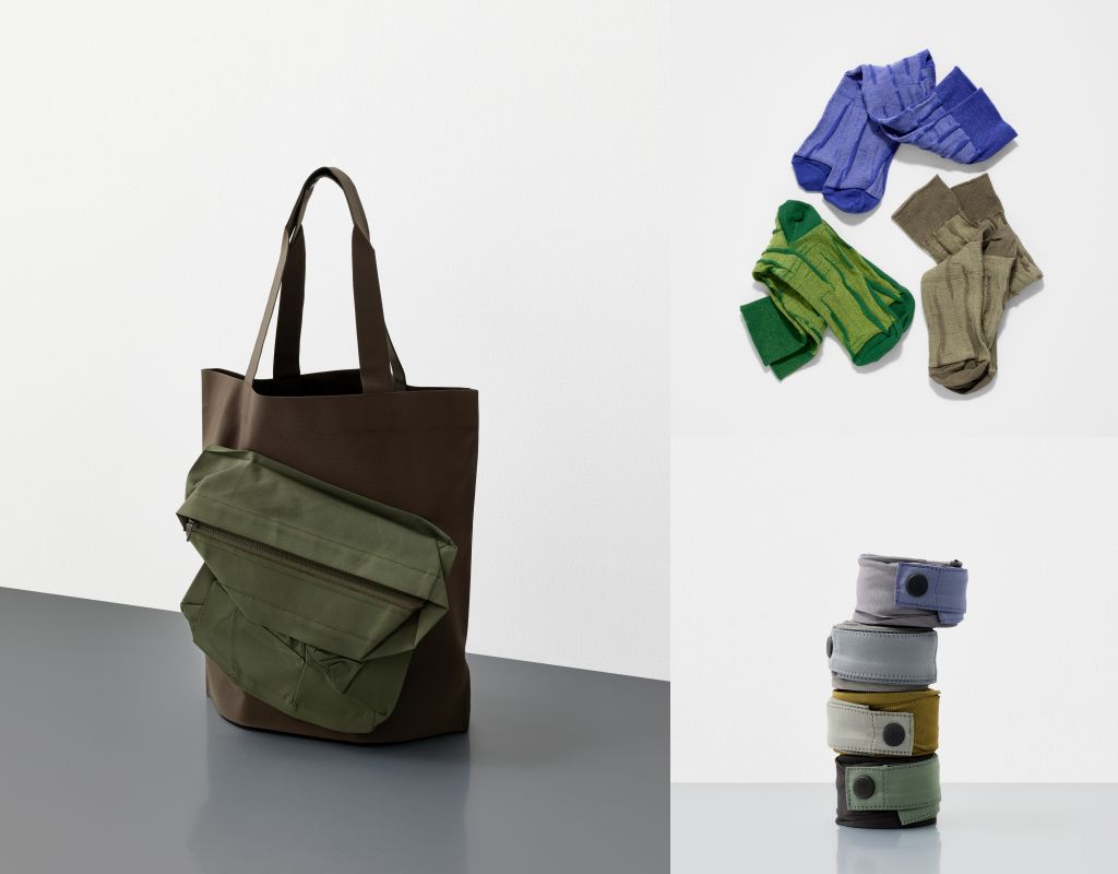 MONOLITH與BLEND系列包款透過布料堆疊,直觀打造創意展現隨機美感。GURU GURU折疊環保袋為日文擬聲詞”ぐるぐる(Guru Guru)”,代表不停旋轉之意,透過纏繞將環保袋折疊成小小體積方便收納使用,完美演繹IM MEN壓褶設計概念。