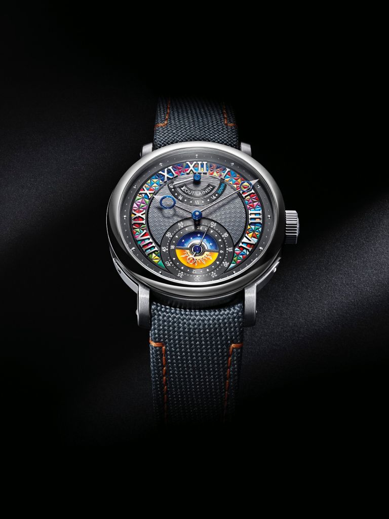 白金羅馬數字下小時刻度環飾有精妙絕倫微型畫圖案並參考古代彩繪玻璃設計,細視可發現圖案呈現LV著名MONOGRAM花朵隱蔽形狀。主錶盤搭載VOUTILAINEN工坊打造指針組,以特別方式將著名"LV"標誌與"VOUTILAINEN"之名結合起來:交錯字母縮寫第2個字母為"VOUTILAINEN"第1個字母。