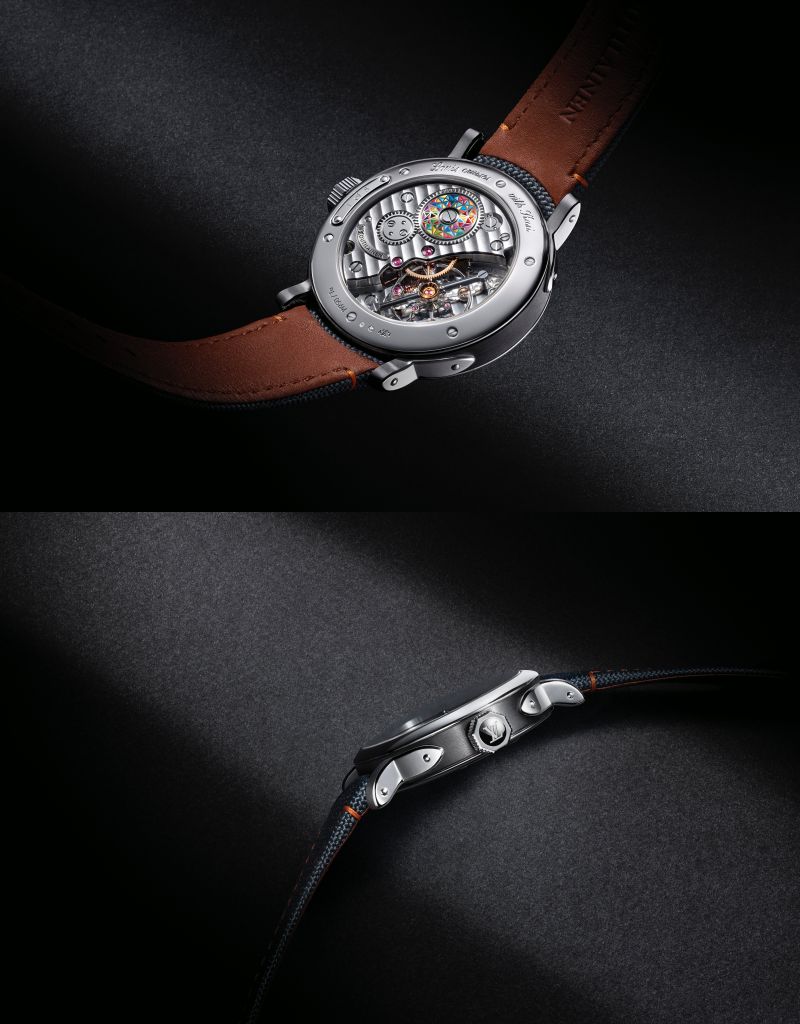 12點鐘位置搭載逆跳動力儲存顯示。透明錶背完整展露機芯,可欣賞內部裝置精密複雜工藝與美感。夾板與橋板採用鎳銀材質,機芯搭載龐大的自製擺輪,採用罕見獨特的游絲系統,游絲外圈為典型飛利浦雙層游絲,內圈使用GROSSMANN內曲線形式提升精準性。