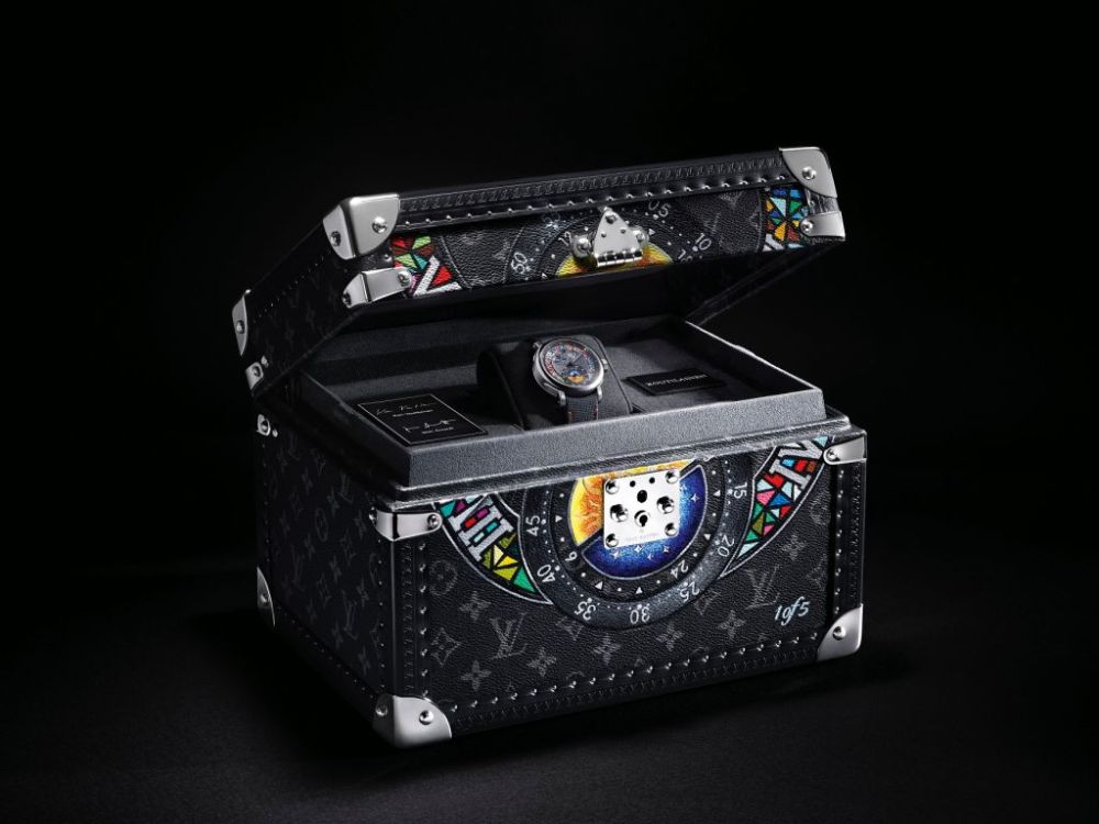 錶背刻有"LOUIS CRUISES WITH KARI"(路易威登與KARI一起巡遊)字樣,需要大約12小時精心製作,為非凡時計添入獨一無二風情。金製錶盤由4個部分組成,鑲鑽拋光小時刻度環是精密複雜的微型畫傑作,由路易威登精湛工匠MARYNA BOSSY手繪而成,涉及使用28種顏色、32個小時精細繪製及總計8小時燒製,是創意與工藝的象徵。