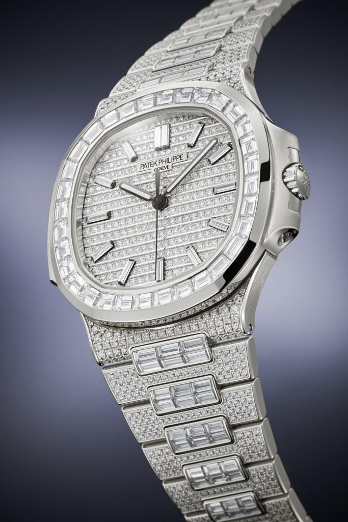 NAUTILUS系列全新REF. 5811/1460G白金高級珠寶錶結合運動奢華與璀璨珠寶工藝,保留經典外型並融入高級珠寶藝術魅力。錶盤採用密鑲鑽石設計,取消日期顯示,八角形錶圈鑲嵌切割鑽石,鑲嵌1285顆明亮式切割鑽石與195顆矩形切割鑽石,搭配鑲鑽石時標精緻細膩,完美突顯經典輪廓與設計語言。