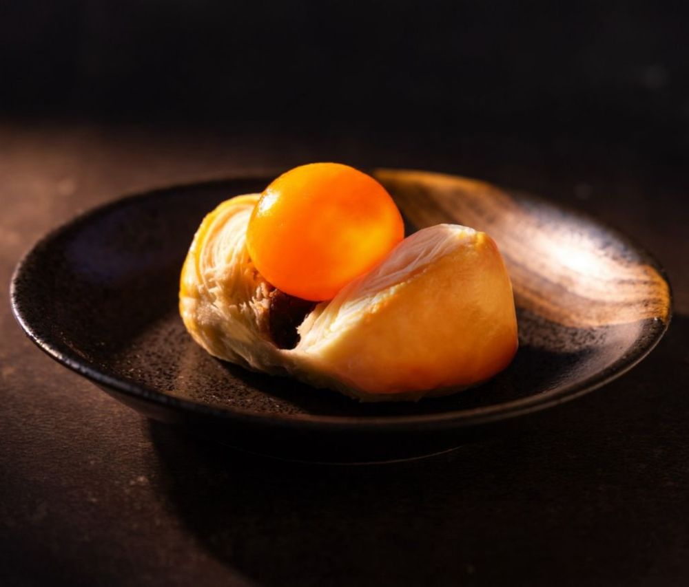 產品主廚王彥欽以法國依思尼無鹽發酵奶油,打造千層月光般酥而不膩口感,選用AA級超大尺寸蛋黃以台灣花雕酒醃釀,減糖烏豆沙與銀川農場有機米穀粉結合健康概念,堆疊出鹹甜交錯、香氣分明完美層次,每口都彷彿咀嚼詩意。