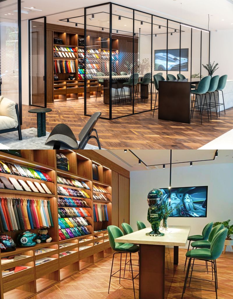 外觀門面運用曲面石材包覆工法,輔以ASTON MARTIN金屬字樣招牌,營造極具辨識尊榮氣場。內部精選石灰岩、實木矩形接花地板與深色金屬點綴鋪陳,打造細膩多層次舒適空間氛圍,充分展現優雅格調與卓越質感。