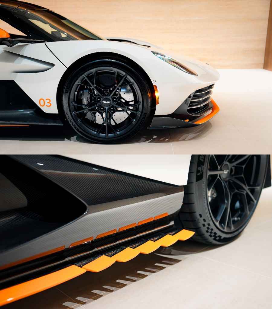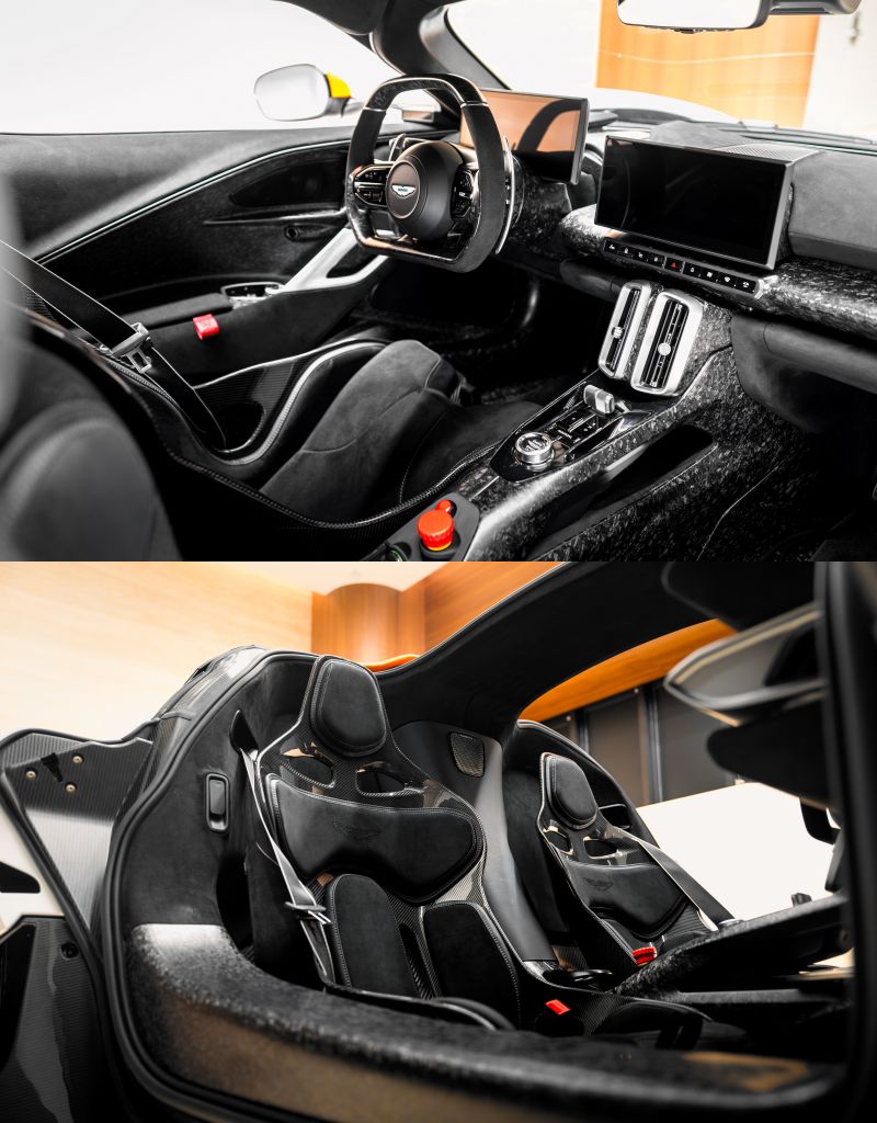 內裝設計傳承VALKYRIE女武神超跑精髓,座艙營造沉浸其中HYPERCAR體驗。猶如F1®賽車般低位臀部到腳跟坐姿,輕量化一體式碳纖維座椅,提供強大支撐與包覆性。方向盤採用盤徑極小一體式碳纖維結構,提供賽車般握感,兼顧都會行駛便利性。