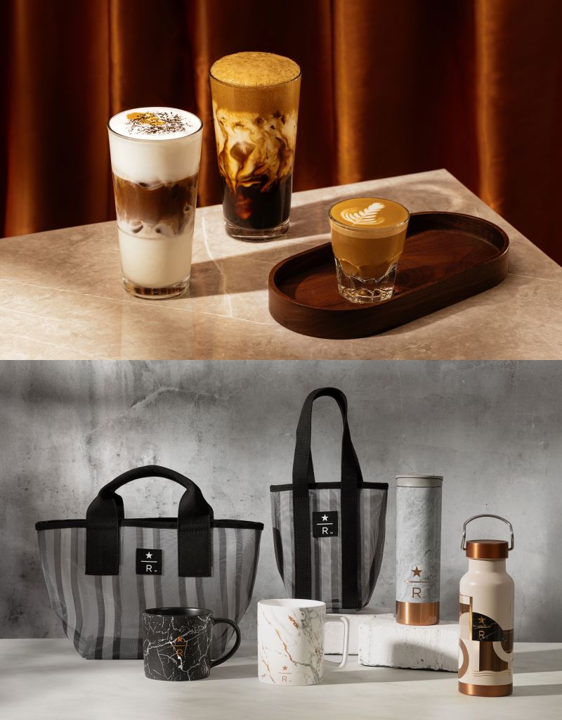 黑典藏直紋網布手提袋及黑典藏直紋網布隨行杯袋以在地特色茄芷袋意象,經典質感黑色結合簡約俐落直紋線條,搭配星巴克典藏LOGO,展現極具現代感優雅氛圍。