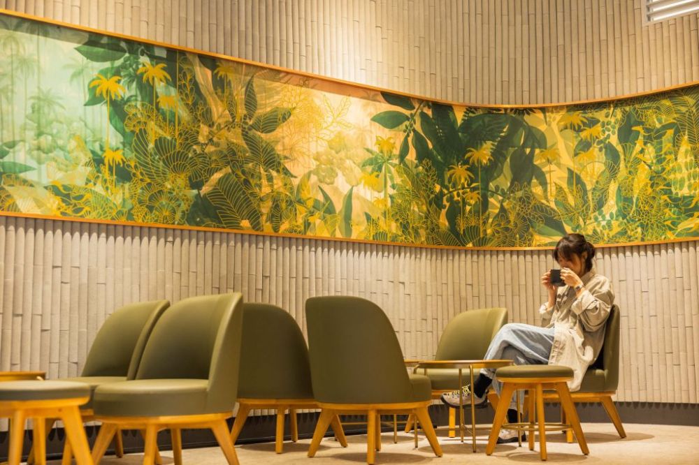 在地藝術家LEHO現場創作藝術牆面,以南港獨特風貌為靈感,巧妙融合霧(山霧、濕氣與水份)、理(南港科技園區的科技與未來)及山(南港四獸山)3大元素,將星巴克的海妖女神引入畫境,描繪典雅女神靜坐於南港城市中,穿梭於當下與未來的交界。